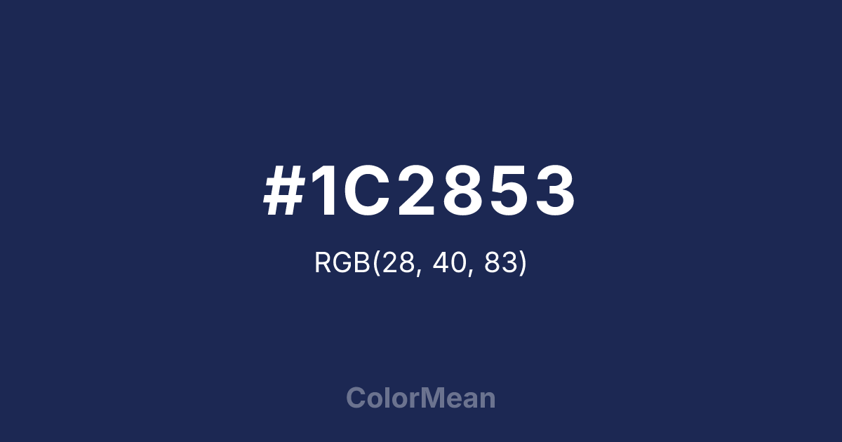 #1C2853 RGB value is (28, 40, 83). The hex color red value is 28, green is 40, and blue is 83. Its HSL format shows a hue of 227°, saturation of 50 percent, and lightness of 22 percent. The CMYK process values are 66 percent, 52 percent, 0 percent, 67 percent.