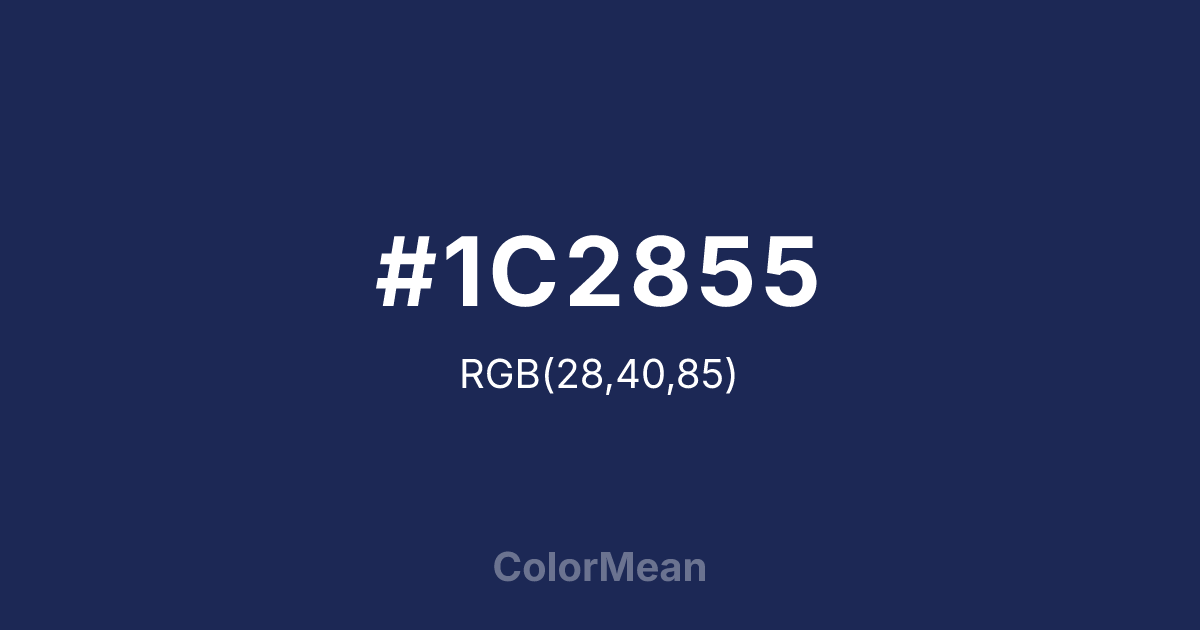 #1C2855 RGB value is (28, 40, 85). The hex color red value is 28, green is 40, and blue is 85. Its HSL format shows a hue of 227°, saturation of 50 percent, and lightness of 22 percent. The CMYK process values are 67 percent, 53 percent, 0 percent, 67 percent.