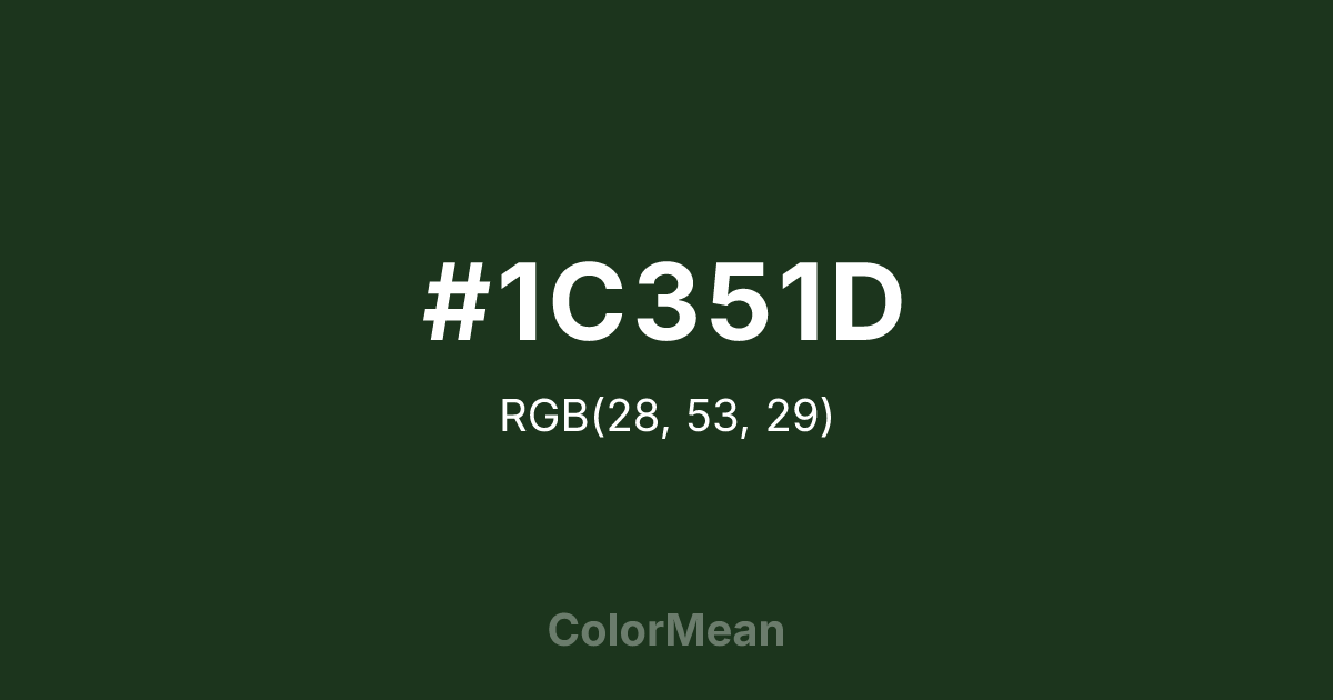 #1C351D RGB value is (28, 53, 29). The hex color red value is 28, green is 53, and blue is 29. Its HSL format shows a hue of 122°, saturation of 31 percent, and lightness of 16 percent. The CMYK process values are 47 percent, 0 percent, 45 percent, 79 percent.