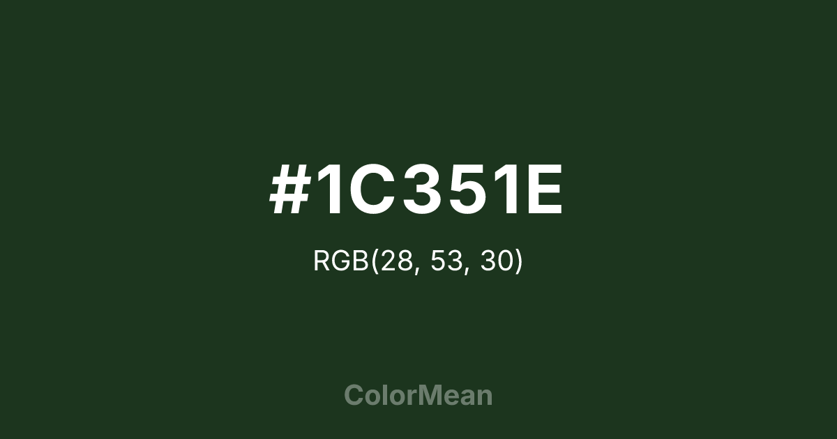 #1C351E RGB value is (28, 53, 30). The hex color red value is 28, green is 53, and blue is 30. Its HSL format shows a hue of 125°, saturation of 31 percent, and lightness of 16 percent. The CMYK process values are 47 percent, 0 percent, 43 percent, 79 percent.