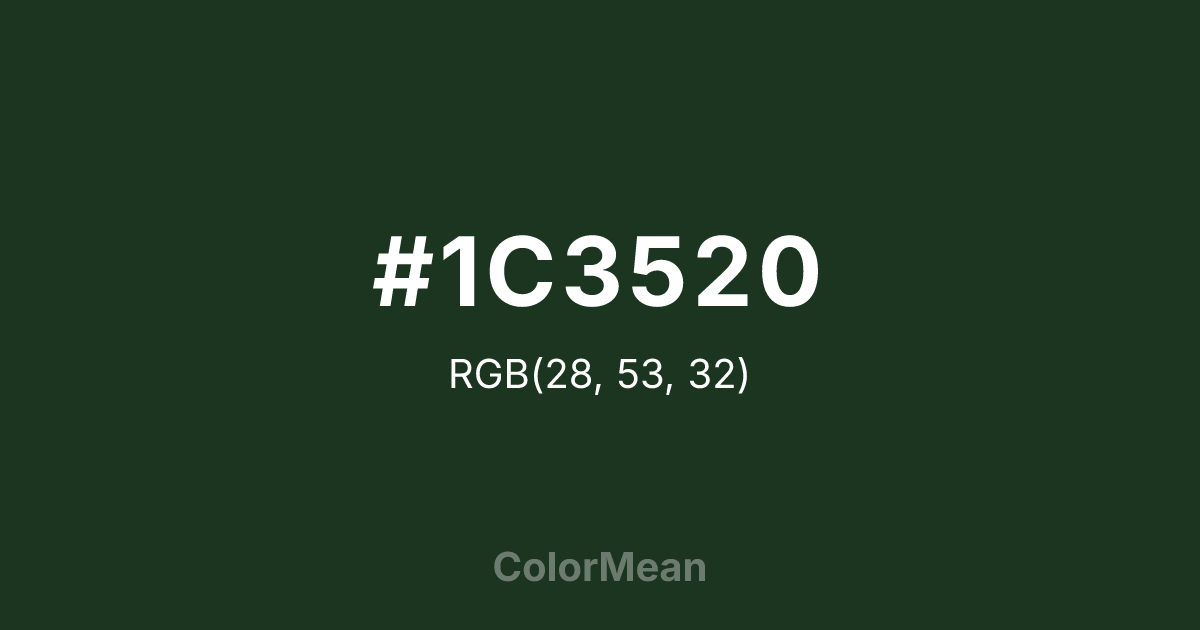 #1C3520 RGB value is (28, 53, 32). The hex color red value is 28, green is 53, and blue is 32. Its HSL format shows a hue of 130°, saturation of 31 percent, and lightness of 16 percent. The CMYK process values are 47 percent, 0 percent, 40 percent, 79 percent.