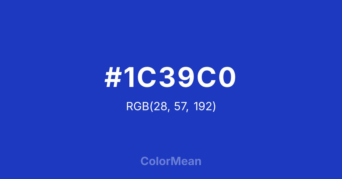 #1C39C0 RGB value is (28, 57, 192). The hex color red value is 28, green is 57, and blue is 192. Its HSL format shows a hue of 229°, saturation of 75 percent, and lightness of 43 percent. The CMYK process values are 85 percent, 70 percent, 0 percent, 25 percent.
