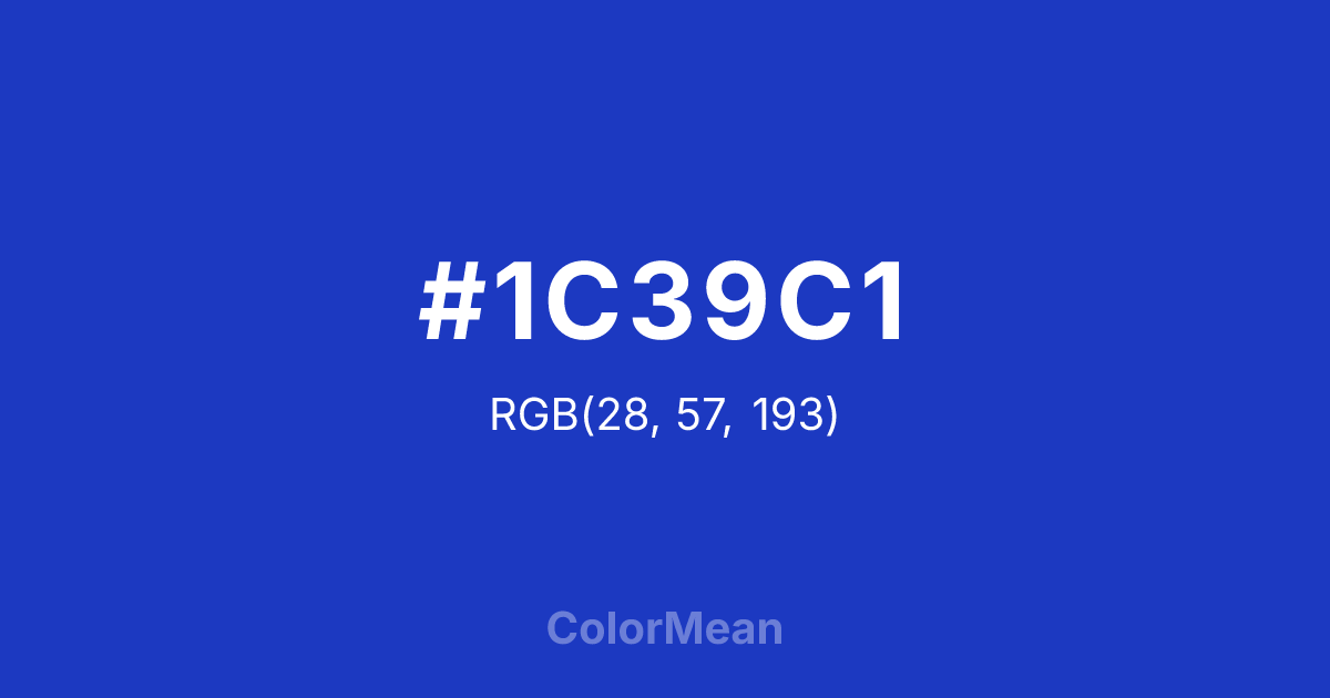 #1C39C1 RGB value is (28, 57, 193). The hex color red value is 28, green is 57, and blue is 193. Its HSL format shows a hue of 229°, saturation of 75 percent, and lightness of 43 percent. The CMYK process values are 85 percent, 70 percent, 0 percent, 24 percent.