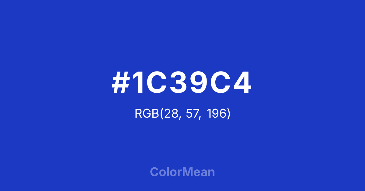 #1C39C4 RGB value is (28, 57, 196). The hex color red value is 28, green is 57, and blue is 196. Its HSL format shows a hue of 230°, saturation of 75 percent, and lightness of 44 percent. The CMYK process values are 86 percent, 71 percent, 0 percent, 23 percent.