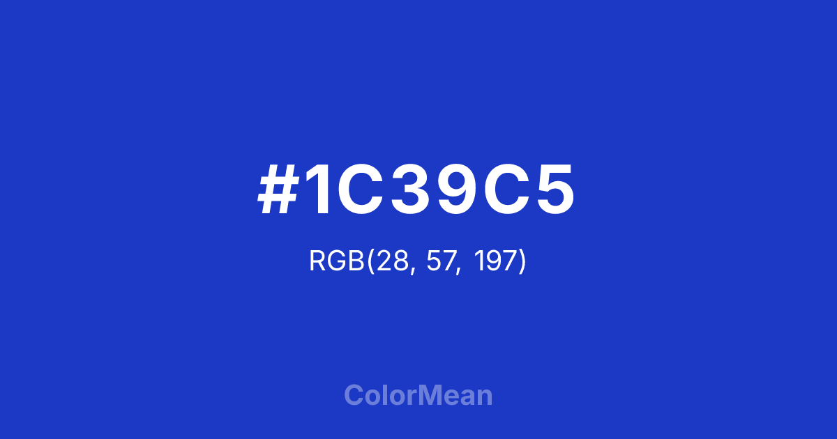 #1C39C5 RGB value is (28, 57, 197). The hex color red value is 28, green is 57, and blue is 197. Its HSL format shows a hue of 230°, saturation of 75 percent, and lightness of 44 percent. The CMYK process values are 86 percent, 71 percent, 0 percent, 23 percent.