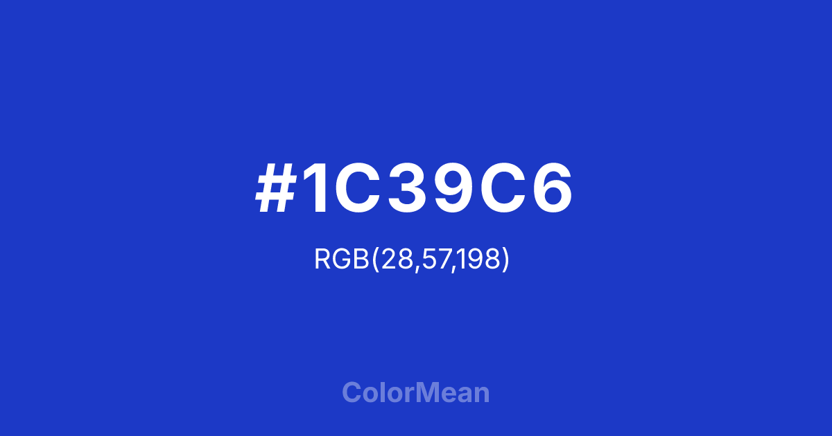 #1C39C6 RGB value is (28, 57, 198). The hex color red value is 28, green is 57, and blue is 198. Its HSL format shows a hue of 230°, saturation of 75 percent, and lightness of 44 percent. The CMYK process values are 86 percent, 71 percent, 0 percent, 22 percent.