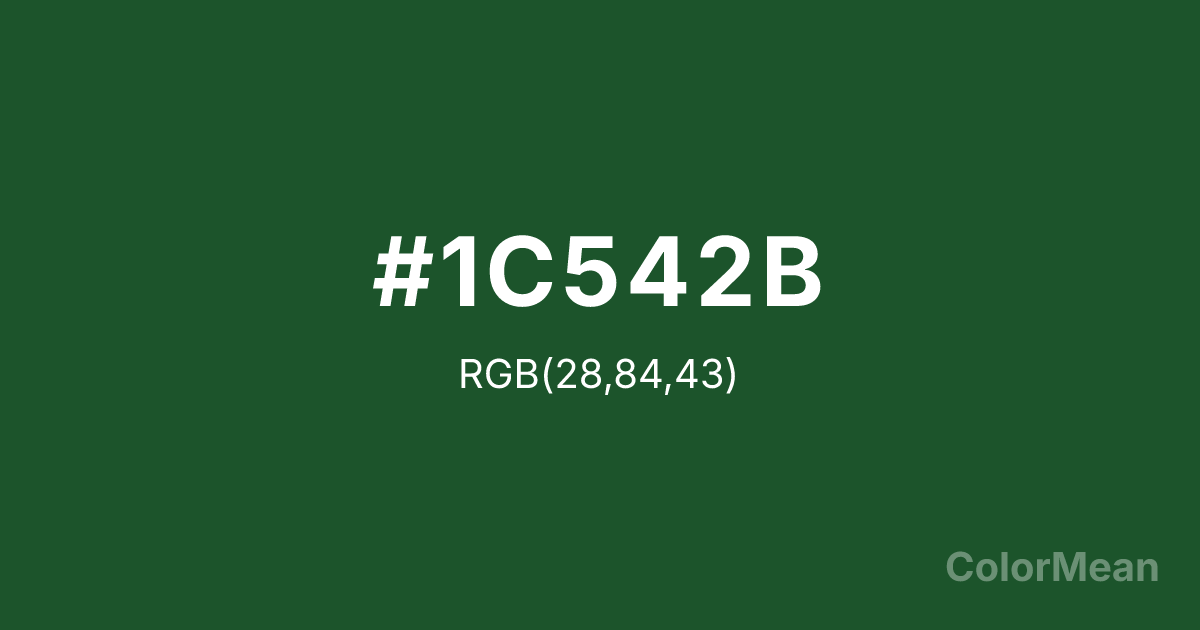 #1C542B RGB value is (28, 84, 43). The hex color red value is 28, green is 84, and blue is 43. Its HSL format shows a hue of 136°, saturation of 50 percent, and lightness of 22 percent. The CMYK process values are 67 percent, 0 percent, 49 percent, 67 percent.