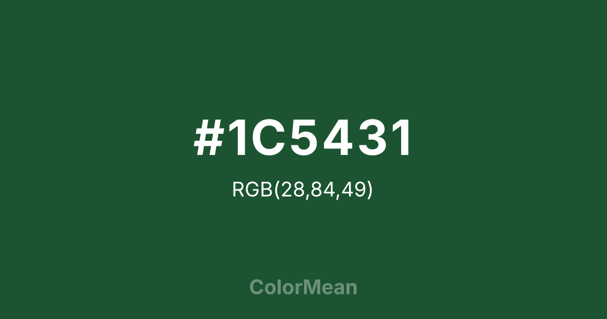 #1C5431 RGB value is (28, 84, 49). The hex color red value is 28, green is 84, and blue is 49. Its HSL format shows a hue of 143°, saturation of 50 percent, and lightness of 22 percent. The CMYK process values are 67 percent, 0 percent, 42 percent, 67 percent.