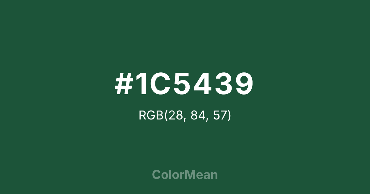 #1C5439 RGB value is (28, 84, 57). The hex color red value is 28, green is 84, and blue is 57. Its HSL format shows a hue of 151°, saturation of 50 percent, and lightness of 22 percent. The CMYK process values are 67 percent, 0 percent, 32 percent, 67 percent.