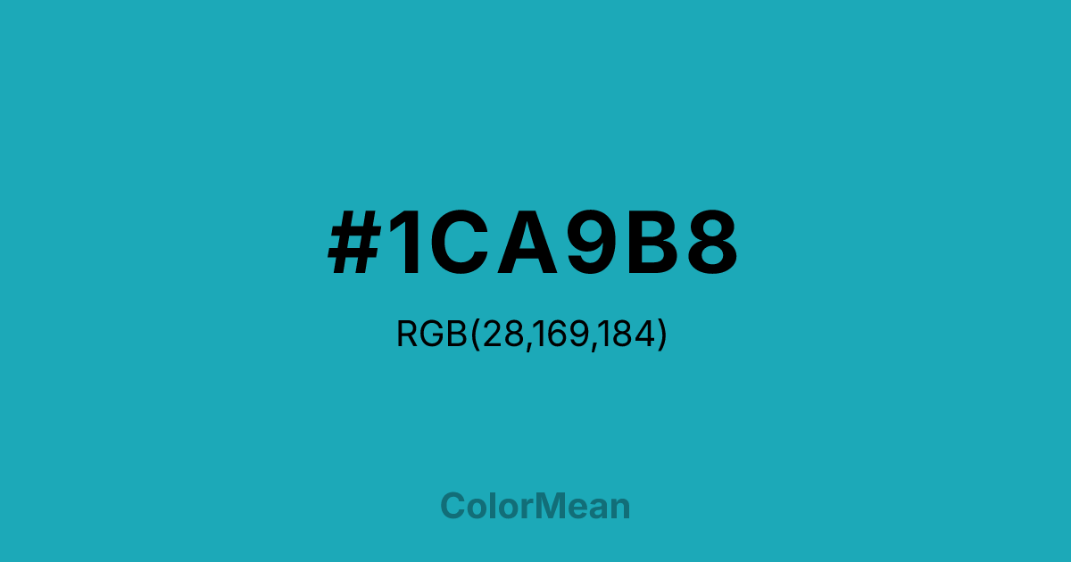 #1CA9B8 RGB value is (28, 169, 184). The hex color red value is 28, green is 169, and blue is 184. Its HSL format shows a hue of 186°, saturation of 74 percent, and lightness of 42 percent. The CMYK process values are 85 percent, 8 percent, 0 percent, 28 percent.