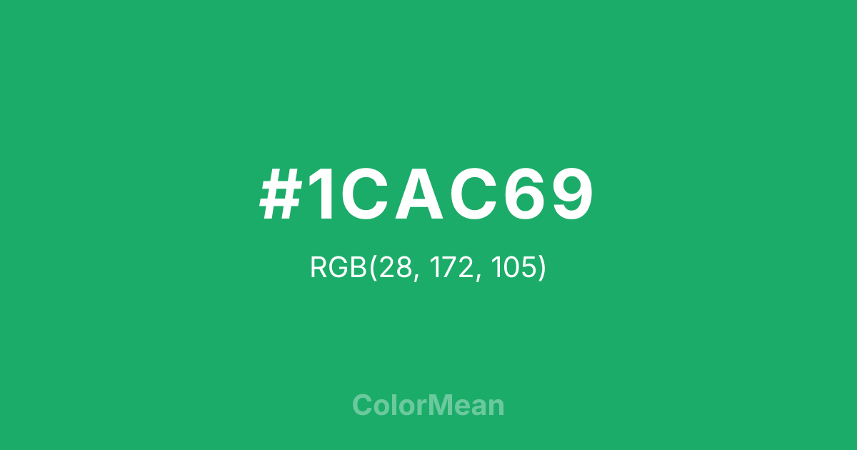 #1CAC69 RGB value is (28, 172, 105). The hex color red value is 28, green is 172, and blue is 105. Its HSL format shows a hue of 152°, saturation of 72 percent, and lightness of 39 percent. The CMYK process values are 84 percent, 0 percent, 39 percent, 33 percent.