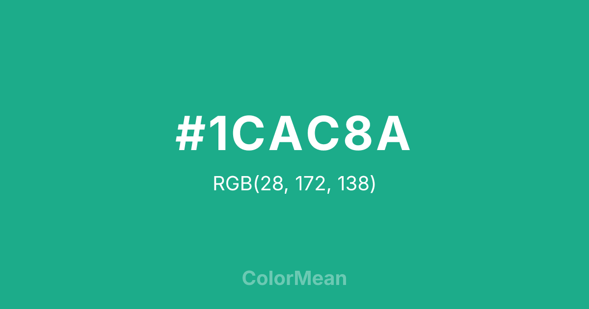 #1CAC8A RGB value is (28, 172, 138). The hex color red value is 28, green is 172, and blue is 138. Its HSL format shows a hue of 166°, saturation of 72 percent, and lightness of 39 percent. The CMYK process values are 84 percent, 0 percent, 20 percent, 33 percent.