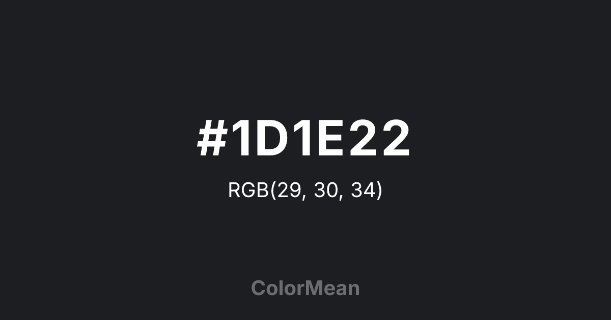 #1D1E22 RGB value is (29, 30, 34). The hex color red value is 29, green is 30, and blue is 34. Its HSL format shows a hue of 228°, saturation of 8 percent, and lightness of 12 percent. The CMYK process values are 15 percent, 12 percent, 0 percent, 87 percent.