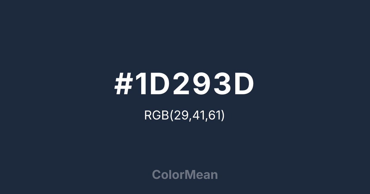 #1D293D RGB value is (29, 41, 61). The hex color red value is 29, green is 41, and blue is 61. Its HSL format shows a hue of 218°, saturation of 36 percent, and lightness of 18 percent. The CMYK process values are 52 percent, 33 percent, 0 percent, 76 percent.
