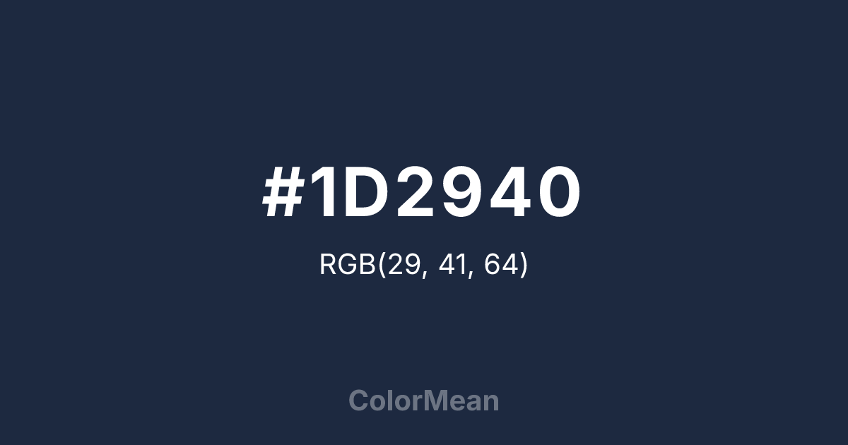 #1D2940 RGB value is (29, 41, 64). The hex color red value is 29, green is 41, and blue is 64. Its HSL format shows a hue of 219°, saturation of 38 percent, and lightness of 18 percent. The CMYK process values are 55 percent, 36 percent, 0 percent, 75 percent.