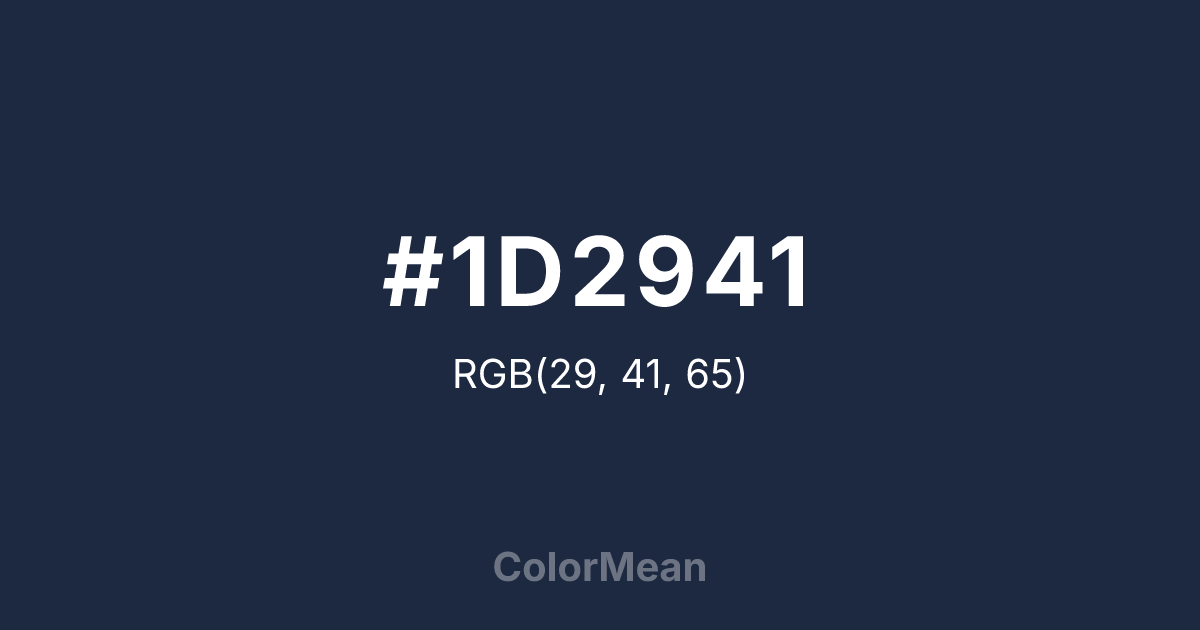 #1D2941 RGB value is (29, 41, 65). The hex color red value is 29, green is 41, and blue is 65. Its HSL format shows a hue of 220°, saturation of 38 percent, and lightness of 18 percent. The CMYK process values are 55 percent, 37 percent, 0 percent, 75 percent.