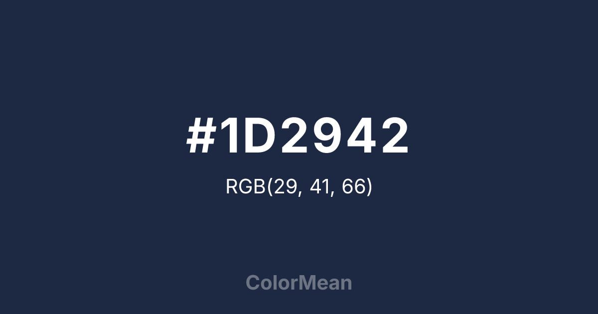 #1D2942 RGB value is (29, 41, 66). The hex color red value is 29, green is 41, and blue is 66. Its HSL format shows a hue of 221°, saturation of 39 percent, and lightness of 19 percent. The CMYK process values are 56 percent, 38 percent, 0 percent, 74 percent.