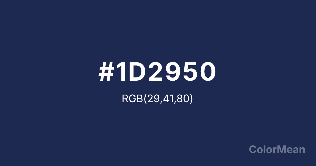 #1D2950 RGB value is (29, 41, 80). The hex color red value is 29, green is 41, and blue is 80. Its HSL format shows a hue of 226°, saturation of 47 percent, and lightness of 21 percent. The CMYK process values are 64 percent, 49 percent, 0 percent, 69 percent.
