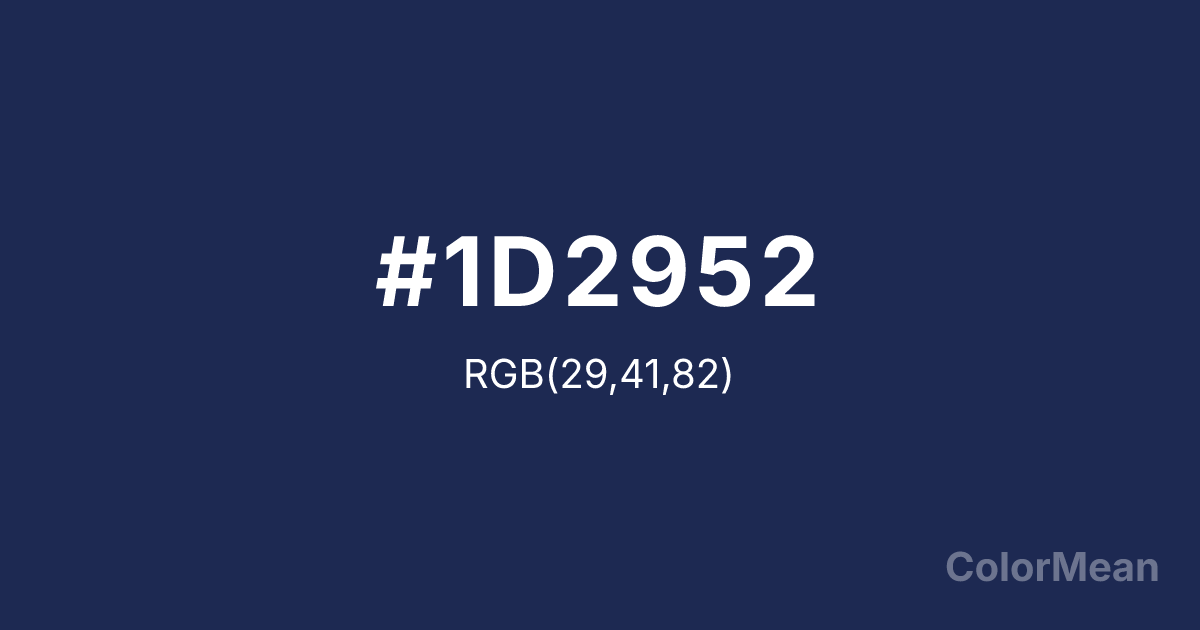 #1D2952 RGB value is (29, 41, 82). The hex color red value is 29, green is 41, and blue is 82. Its HSL format shows a hue of 226°, saturation of 48 percent, and lightness of 22 percent. The CMYK process values are 65 percent, 50 percent, 0 percent, 68 percent.