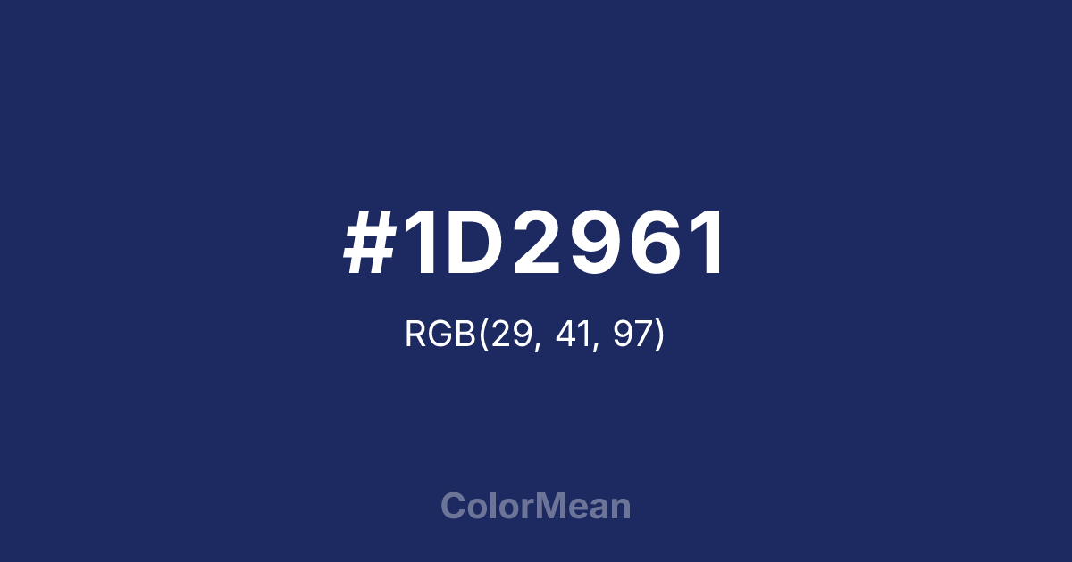 #1D2961 RGB value is (29, 41, 97). The hex color red value is 29, green is 41, and blue is 97. Its HSL format shows a hue of 229°, saturation of 54 percent, and lightness of 25 percent. The CMYK process values are 70 percent, 58 percent, 0 percent, 62 percent.
