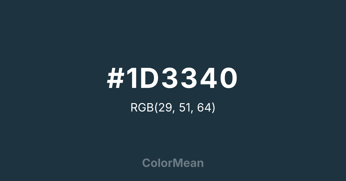 #1D3340 RGB value is (29, 51, 64). The hex color red value is 29, green is 51, and blue is 64. Its HSL format shows a hue of 202°, saturation of 38 percent, and lightness of 18 percent. The CMYK process values are 55 percent, 20 percent, 0 percent, 75 percent.