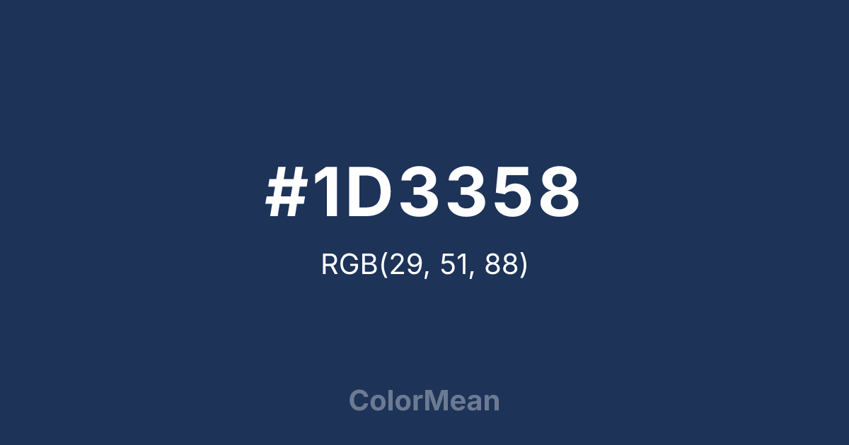 #1D3358 RGB value is (29, 51, 88). The hex color red value is 29, green is 51, and blue is 88. Its HSL format shows a hue of 218°, saturation of 50 percent, and lightness of 23 percent. The CMYK process values are 67 percent, 42 percent, 0 percent, 65 percent.