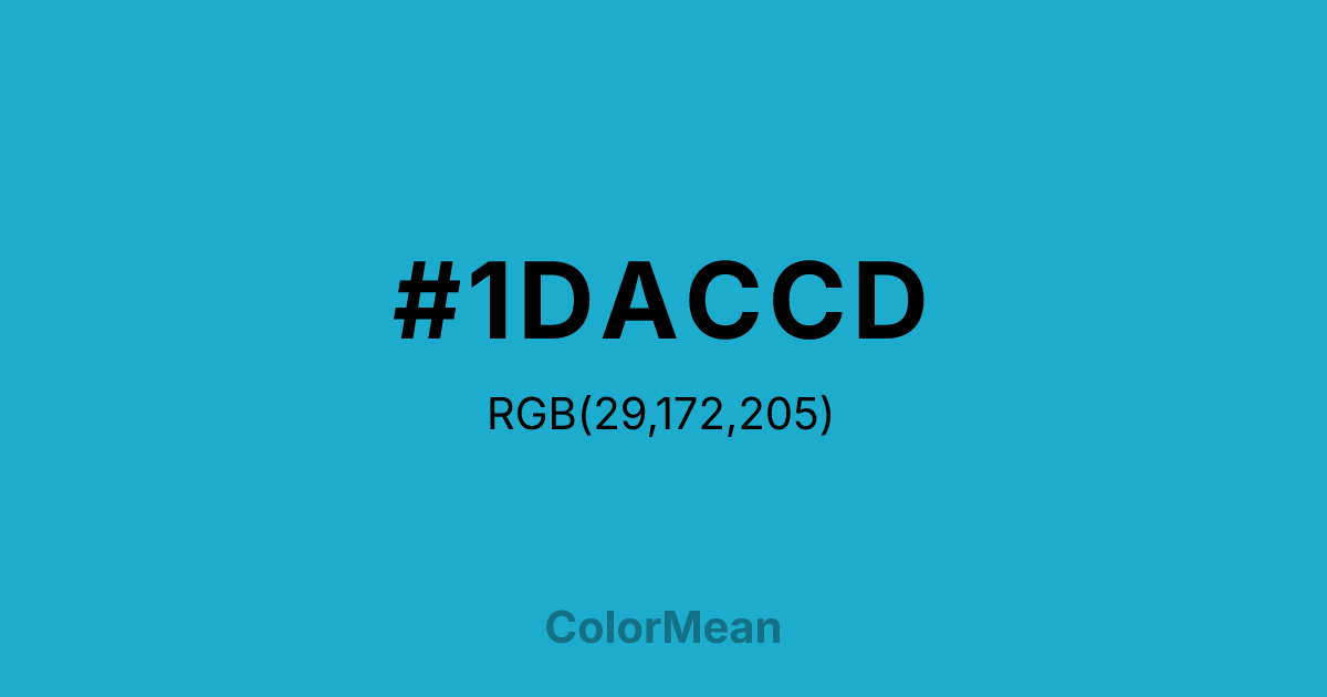 #1DACCD RGB value is (29, 172, 205). The hex color red value is 29, green is 172, and blue is 205. Its HSL format shows a hue of 191°, saturation of 75 percent, and lightness of 46 percent. The CMYK process values are 86 percent, 16 percent, 0 percent, 20 percent.