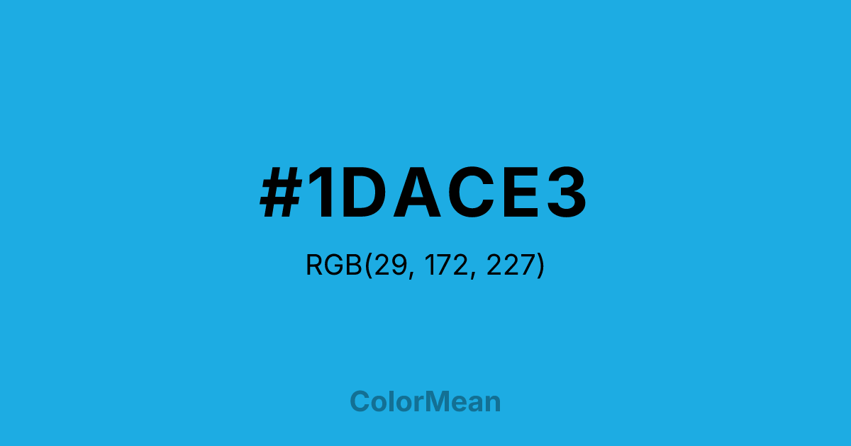 #1DACE3 RGB value is (29, 172, 227). The hex color red value is 29, green is 172, and blue is 227. Its HSL format shows a hue of 197°, saturation of 78 percent, and lightness of 50 percent. The CMYK process values are 87 percent, 24 percent, 0 percent, 11 percent.