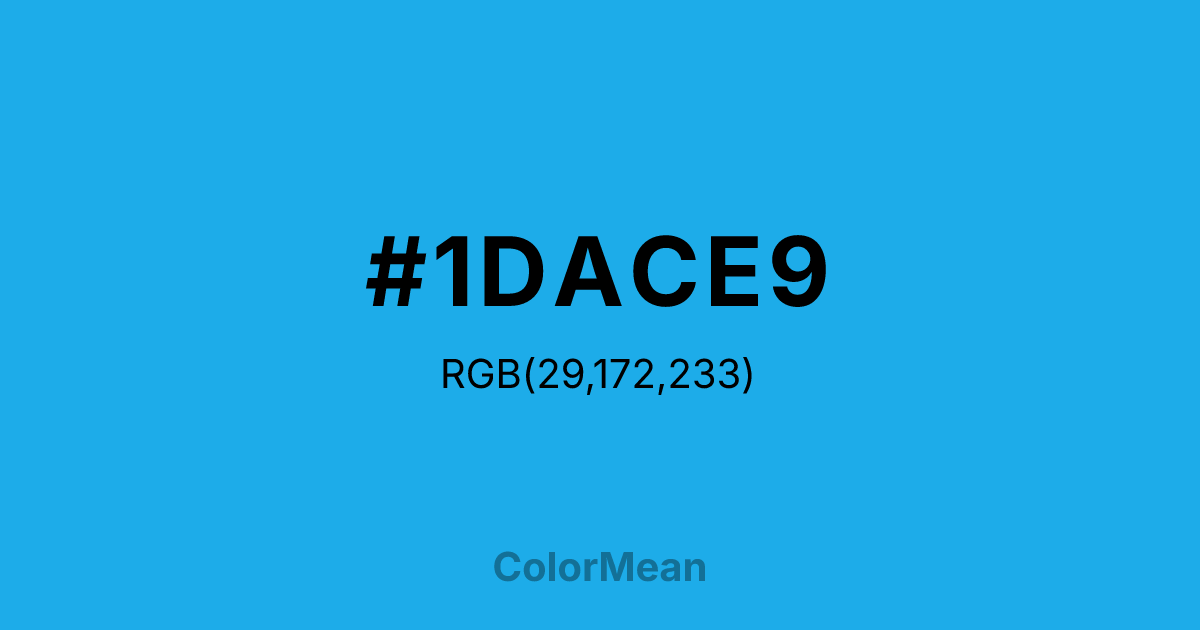#1DACE9 RGB value is (29, 172, 233). The hex color red value is 29, green is 172, and blue is 233. Its HSL format shows a hue of 198°, saturation of 82 percent, and lightness of 51 percent. The CMYK process values are 88 percent, 26 percent, 0 percent, 9 percent.