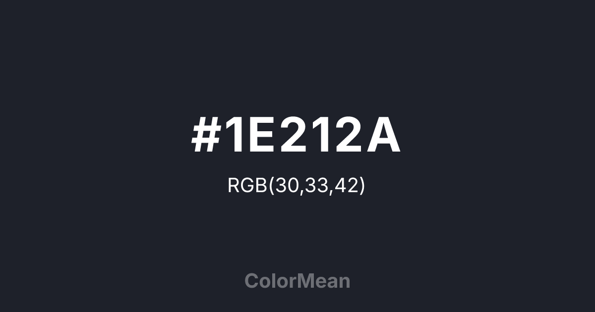 #1E212A RGB value is (30, 33, 42). The hex color red value is 30, green is 33, and blue is 42. Its HSL format shows a hue of 225°, saturation of 17 percent, and lightness of 14 percent. The CMYK process values are 29 percent, 21 percent, 0 percent, 84 percent.