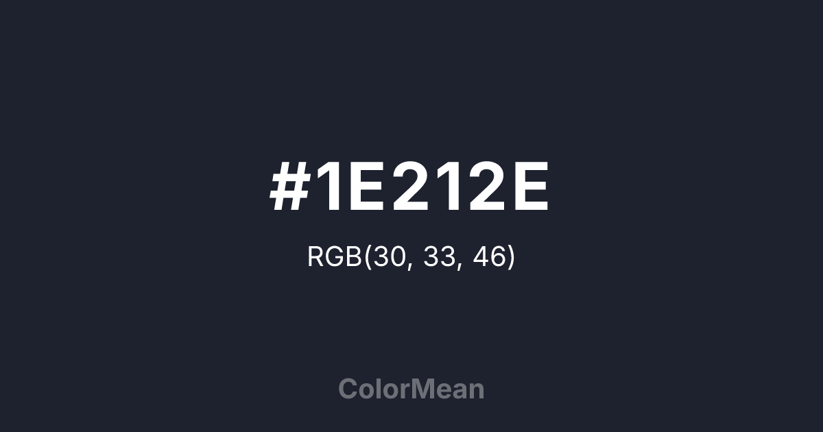 #1E212E RGB value is (30, 33, 46). The hex color red value is 30, green is 33, and blue is 46. Its HSL format shows a hue of 229°, saturation of 21 percent, and lightness of 15 percent. The CMYK process values are 35 percent, 28 percent, 0 percent, 82 percent.