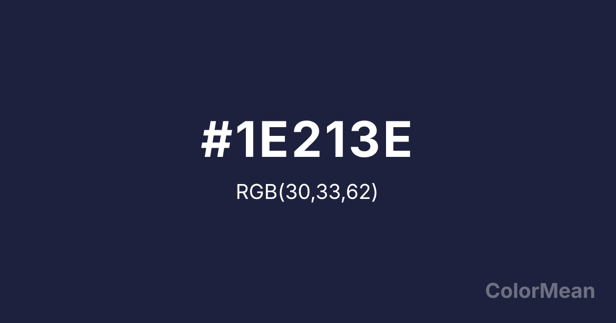 #1E213E RGB value is (30, 33, 62). The hex color red value is 30, green is 33, and blue is 62. Its HSL format shows a hue of 234°, saturation of 35 percent, and lightness of 18 percent. The CMYK process values are 52 percent, 47 percent, 0 percent, 76 percent.