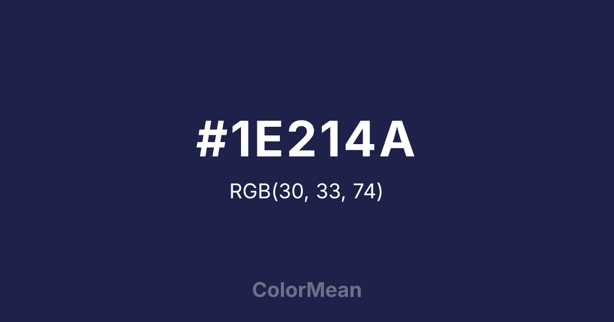 #1E214A RGB value is (30, 33, 74). The hex color red value is 30, green is 33, and blue is 74. Its HSL format shows a hue of 236°, saturation of 42 percent, and lightness of 20 percent. The CMYK process values are 59 percent, 55 percent, 0 percent, 71 percent.