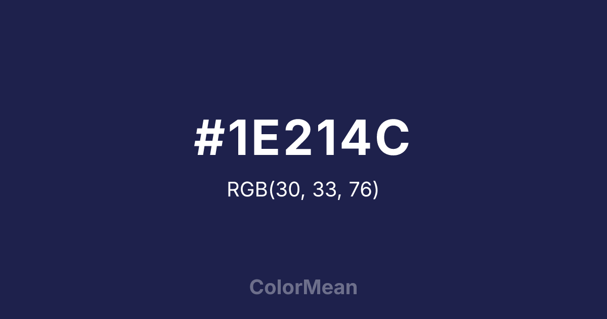 #1E214C RGB value is (30, 33, 76). The hex color red value is 30, green is 33, and blue is 76. Its HSL format shows a hue of 236°, saturation of 43 percent, and lightness of 21 percent. The CMYK process values are 61 percent, 57 percent, 0 percent, 70 percent.