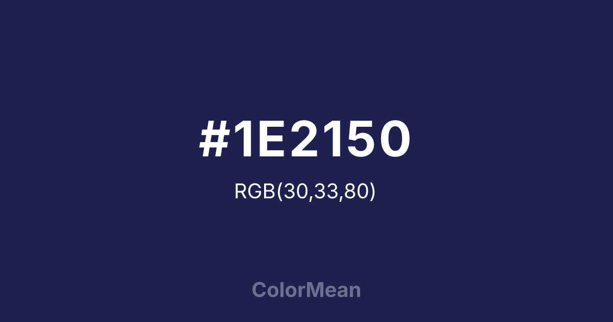 #1E2150 RGB value is (30, 33, 80). The hex color red value is 30, green is 33, and blue is 80. Its HSL format shows a hue of 236°, saturation of 45 percent, and lightness of 22 percent. The CMYK process values are 62 percent, 59 percent, 0 percent, 69 percent.