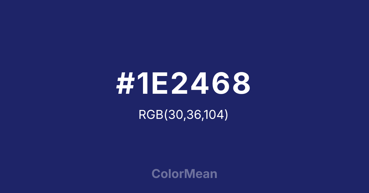 #1E2468 RGB value is (30, 36, 104). The hex color red value is 30, green is 36, and blue is 104. Its HSL format shows a hue of 235°, saturation of 55 percent, and lightness of 26 percent. The CMYK process values are 71 percent, 65 percent, 0 percent, 59 percent.