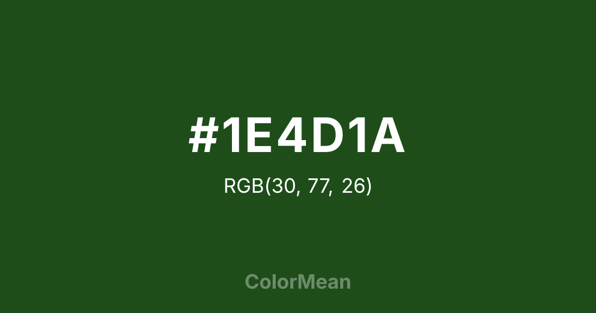 #1E4D1A RGB value is (30, 77, 26). The hex color red value is 30, green is 77, and blue is 26. Its HSL format shows a hue of 115°, saturation of 50 percent, and lightness of 20 percent. The CMYK process values are 61 percent, 0 percent, 66 percent, 70 percent.