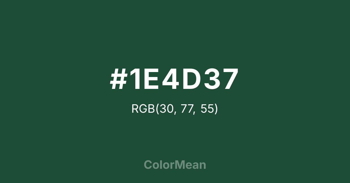 #1E4D37 RGB value is (30, 77, 55). The hex color red value is 30, green is 77, and blue is 55. Its HSL format shows a hue of 152°, saturation of 44 percent, and lightness of 21 percent. The CMYK process values are 61 percent, 0 percent, 29 percent, 70 percent.