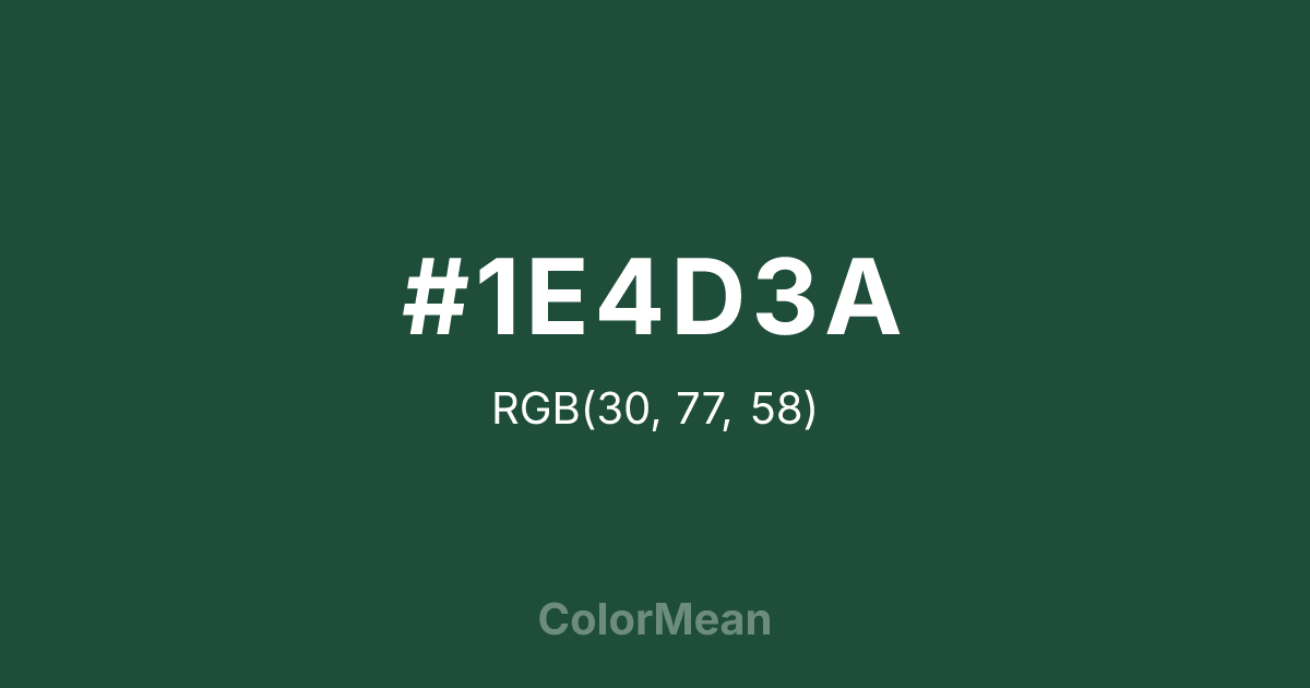 #1E4D3A RGB value is (30, 77, 58). The hex color red value is 30, green is 77, and blue is 58. Its HSL format shows a hue of 156°, saturation of 44 percent, and lightness of 21 percent. The CMYK process values are 61 percent, 0 percent, 25 percent, 70 percent.