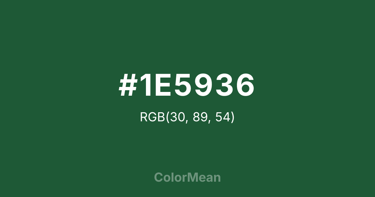 #1E5936 RGB value is (30, 89, 54). The hex color red value is 30, green is 89, and blue is 54. Its HSL format shows a hue of 144°, saturation of 50 percent, and lightness of 23 percent. The CMYK process values are 66 percent, 0 percent, 39 percent, 65 percent.