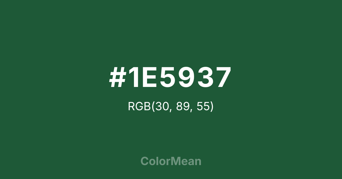 #1E5937 RGB value is (30, 89, 55). The hex color red value is 30, green is 89, and blue is 55. Its HSL format shows a hue of 145°, saturation of 50 percent, and lightness of 23 percent. The CMYK process values are 66 percent, 0 percent, 38 percent, 65 percent.