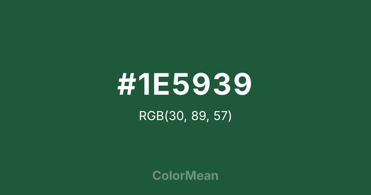 #1E5939 RGB value is (30, 89, 57). The hex color red value is 30, green is 89, and blue is 57. Its HSL format shows a hue of 147°, saturation of 50 percent, and lightness of 23 percent. The CMYK process values are 66 percent, 0 percent, 36 percent, 65 percent.