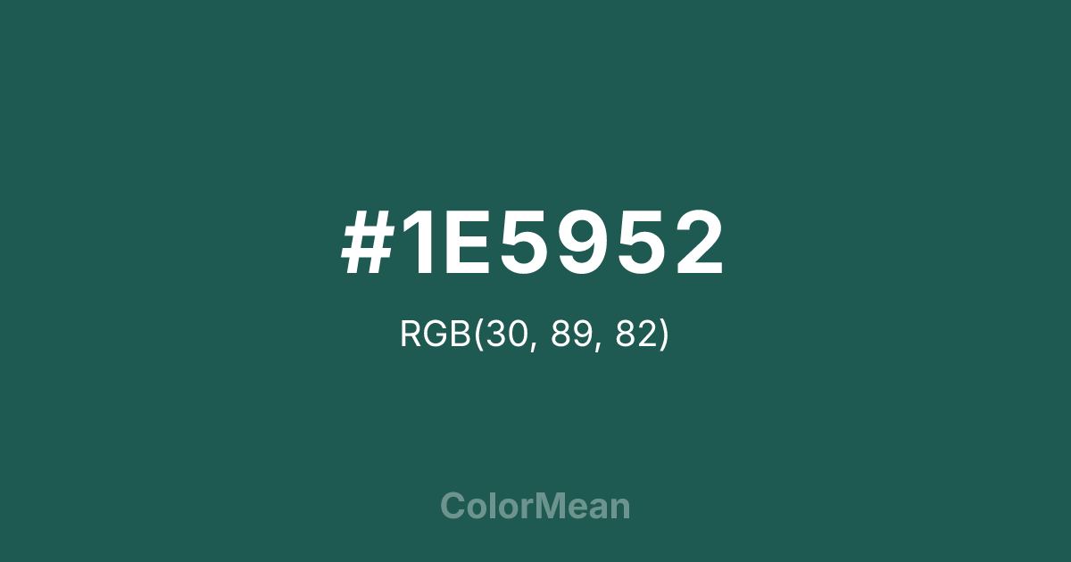 #1E5952 RGB value is (30, 89, 82). The hex color red value is 30, green is 89, and blue is 82. Its HSL format shows a hue of 173°, saturation of 50 percent, and lightness of 23 percent. The CMYK process values are 66 percent, 0 percent, 8 percent, 65 percent.