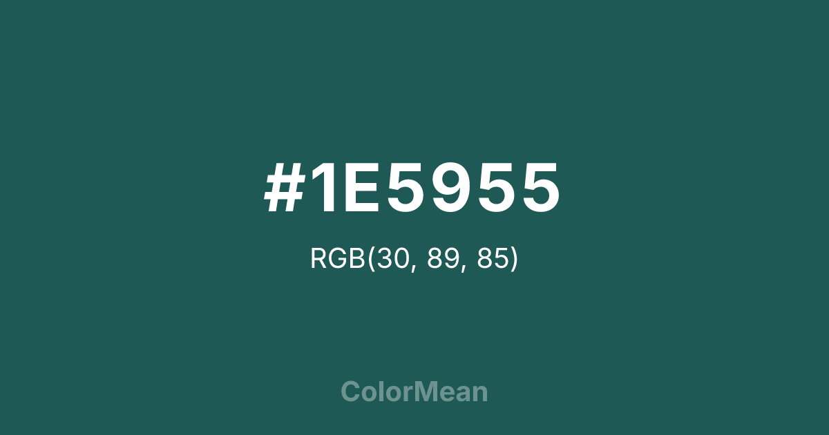#1E5955 RGB value is (30, 89, 85). The hex color red value is 30, green is 89, and blue is 85. Its HSL format shows a hue of 176°, saturation of 50 percent, and lightness of 23 percent. The CMYK process values are 66 percent, 0 percent, 4 percent, 65 percent.