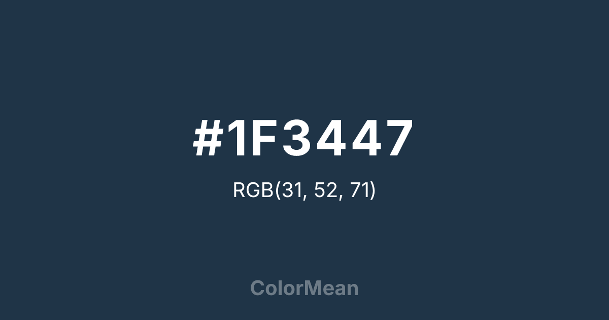 #1F3447 RGB value is (31, 52, 71). The hex color red value is 31, green is 52, and blue is 71. Its HSL format shows a hue of 209°, saturation of 39 percent, and lightness of 20 percent. The CMYK process values are 56 percent, 27 percent, 0 percent, 72 percent.