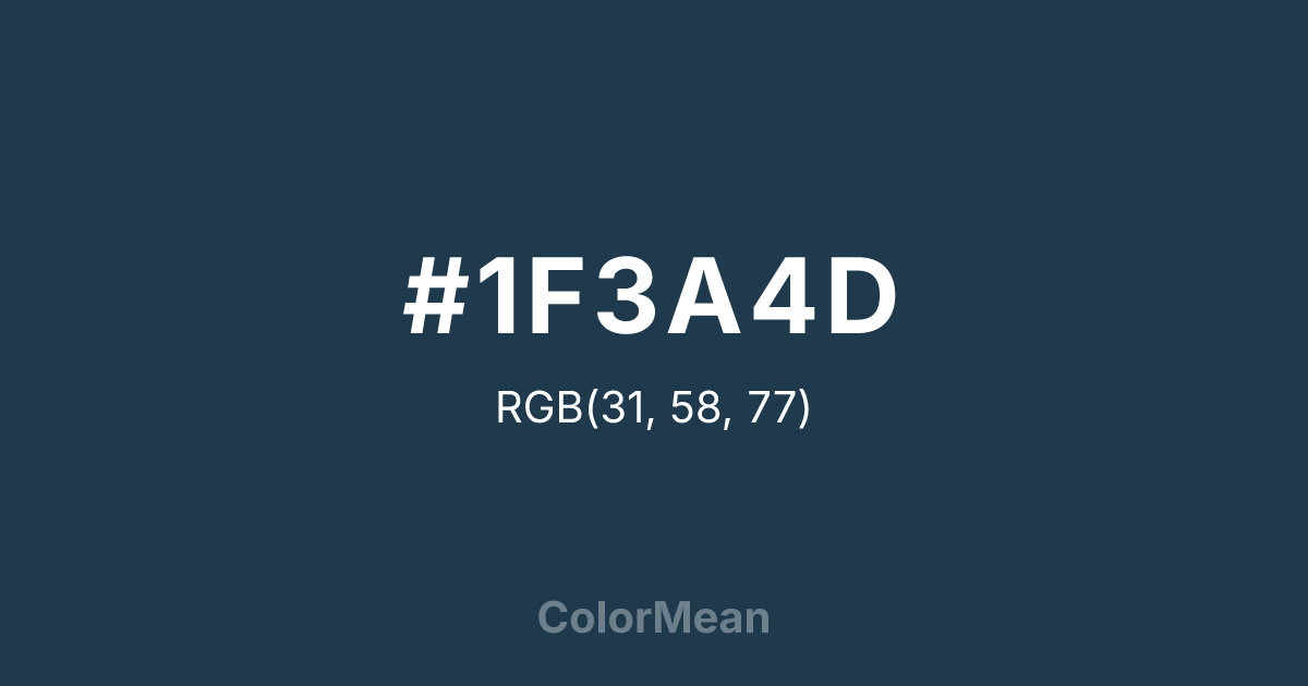 #1F3A4D RGB value is (31, 58, 77). The hex color red value is 31, green is 58, and blue is 77. Its HSL format shows a hue of 205°, saturation of 43 percent, and lightness of 21 percent. The CMYK process values are 60 percent, 25 percent, 0 percent, 70 percent.