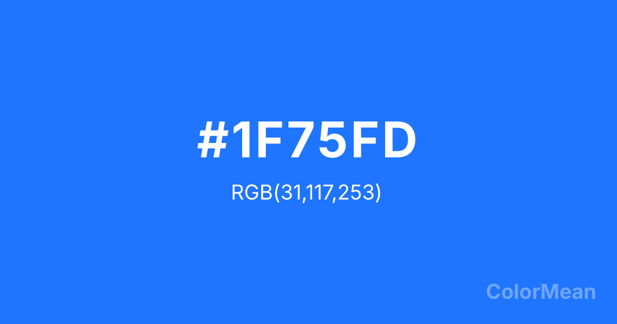 #1F75FD RGB value is (31, 117, 253). The hex color red value is 31, green is 117, and blue is 253. Its HSL format shows a hue of 217°, saturation of 98 percent, and lightness of 56 percent. The CMYK process values are 88 percent, 54 percent, 0 percent, 1 percent.
