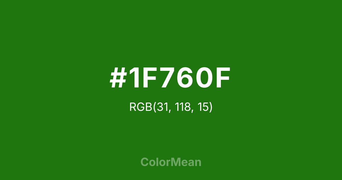 #1F760F RGB value is (31, 118, 15). The hex color red value is 31, green is 118, and blue is 15. Its HSL format shows a hue of 111°, saturation of 77 percent, and lightness of 26 percent. The CMYK process values are 74 percent, 0 percent, 87 percent, 54 percent.