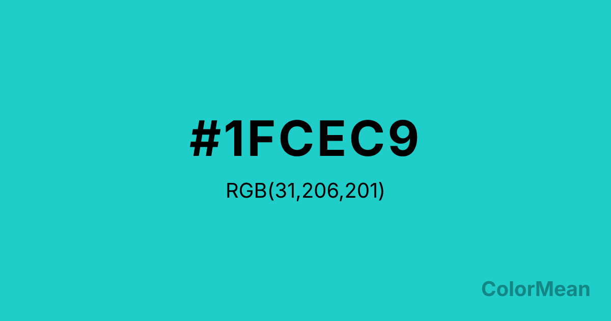 #1FCEC9 RGB value is (31, 206, 201). The hex color red value is 31, green is 206, and blue is 201. Its HSL format shows a hue of 178°, saturation of 74 percent, and lightness of 46 percent. The CMYK process values are 85 percent, 0 percent, 2 percent, 19 percent.