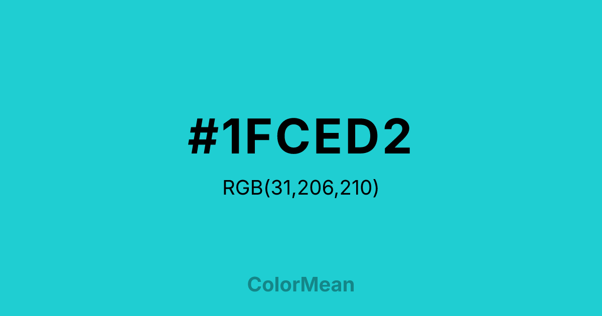 #1FCED2 RGB value is (31, 206, 210). The hex color red value is 31, green is 206, and blue is 210. Its HSL format shows a hue of 181°, saturation of 74 percent, and lightness of 47 percent. The CMYK process values are 85 percent, 2 percent, 0 percent, 18 percent.